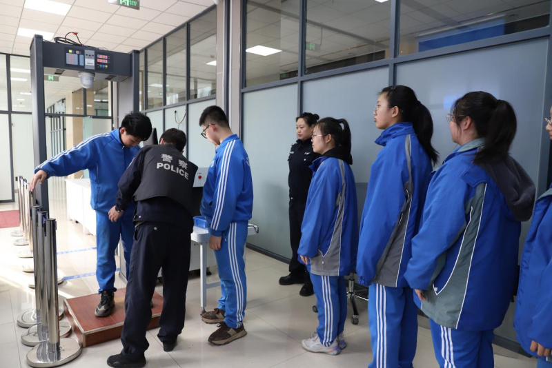 在法院安检入口,法警向同学们详细讲解安检的重要性和操作规范:“法院安检不仅是保障司法秩序的重要防线,也是维护每个人安全的必要环节。”同学们按照指引,依次将书包、水杯等物品放入安检仪,有序通过金属探测门,部分同学还亲身体验了手持金属探测器的检查流程。完成安检后,同学们在讲解员的带领下走进诉讼服务中心。同学们围在各个功能区域,认真倾听的同时,不时提出“未成年人申请法律援助需要哪些材料”“如何查询案件进展”等问题,干警均耐心细致解答,现场互动氛围热烈。